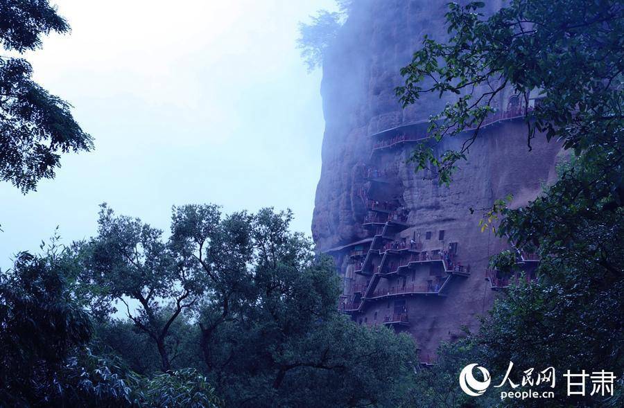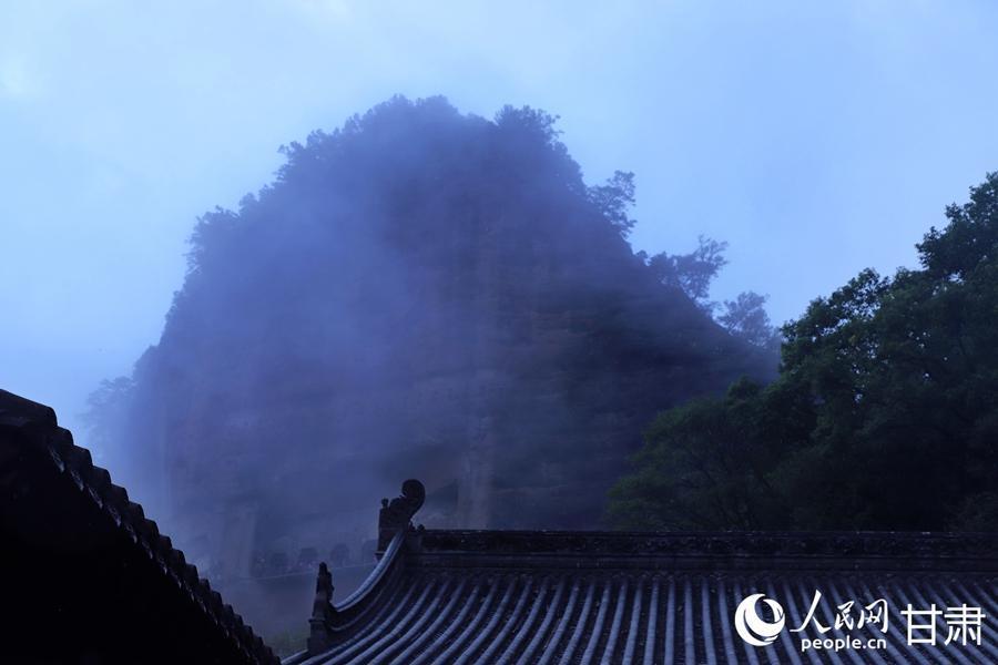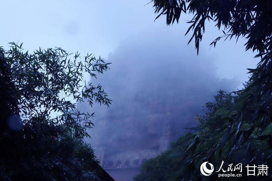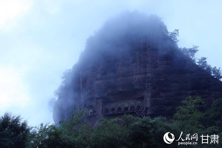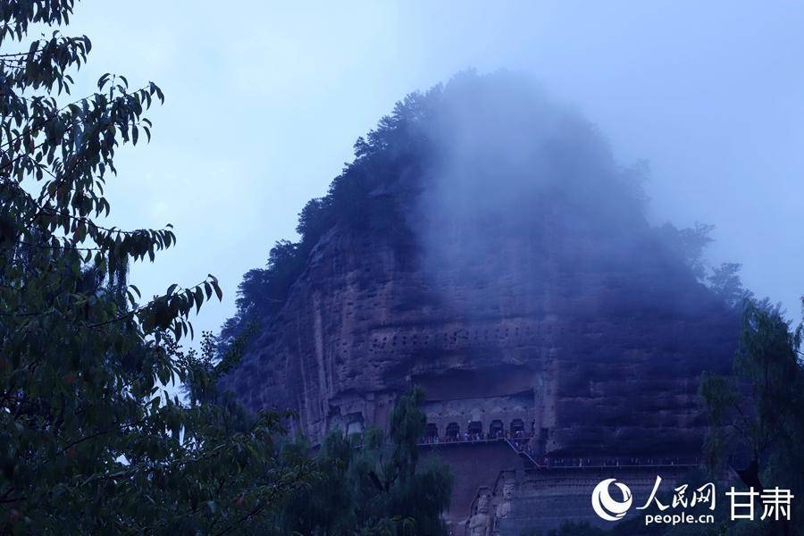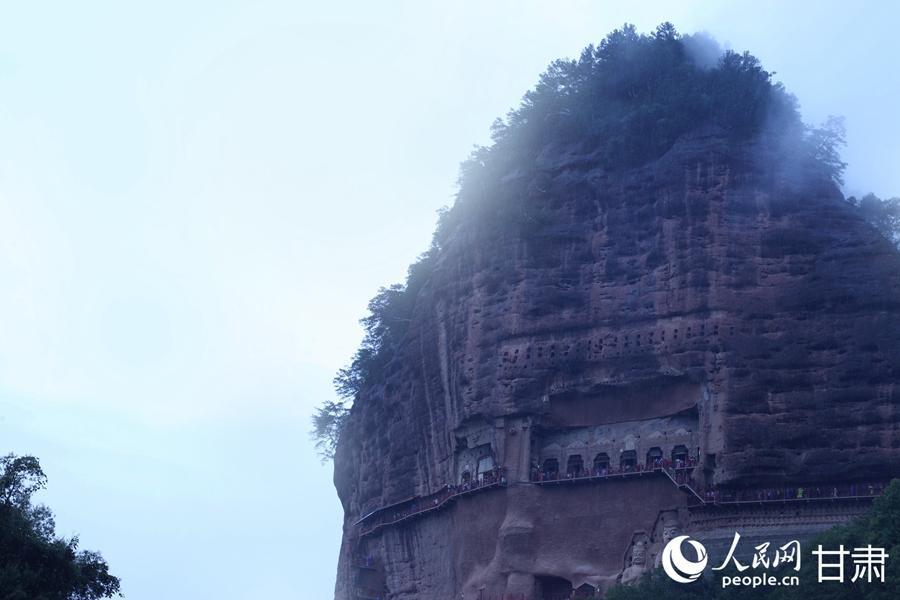 秋日雨后,轻纱般的薄雾拢住麦积山,山峦于氤氲之气中若隐若现,如同一幅意境悠远的水墨丹青。